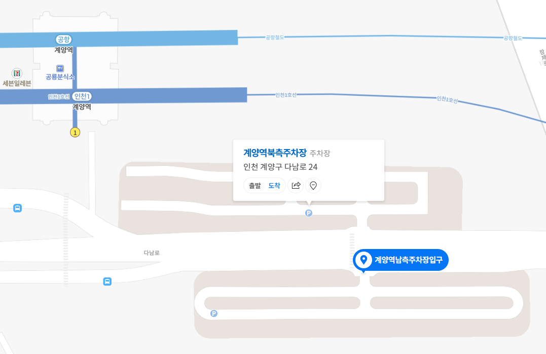 주차장에서 계양역까지 도보로 약 5분 정도 소요돼서 지하철을 타고 김포공항으로 이동할 수 있습니다.
