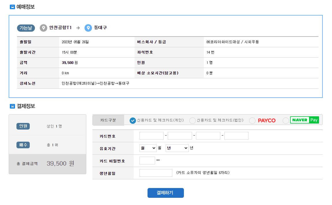 홈페이지에서 예매하는 것과 같이 예매정보(출발, 도착지, 일정, 인원수 등) 선택하시고 좌석선택 후 결제 하시면 됩니다.