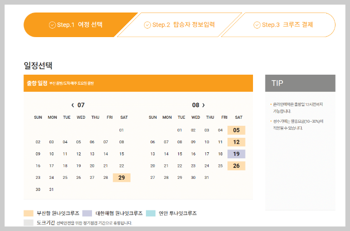 원하시는 날짜를 선택한 후 객실과 탑승인원을 선택하시면 됩니다.