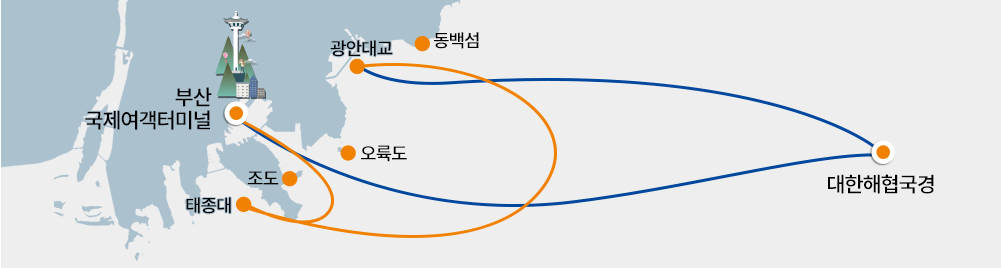 부산항 원나잇 크루즈는 부산항> 태종대> 해운대> 광안리> 부산항으로 다시 돌아오는 노선이며,