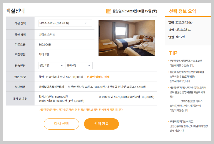 원하시는 날짜를 선택한 후 객실과 탑승인원을 선택하시면 됩니다.