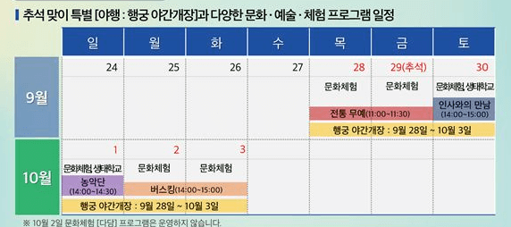 특히 9월 30일(토)에 야외공연장에서 한가위에 가득 찬 달을 보며 소망을 노래하는 국악 공연이 펼쳐져, 공연을 보며 추석을 만끽하실 수 있습니다.
