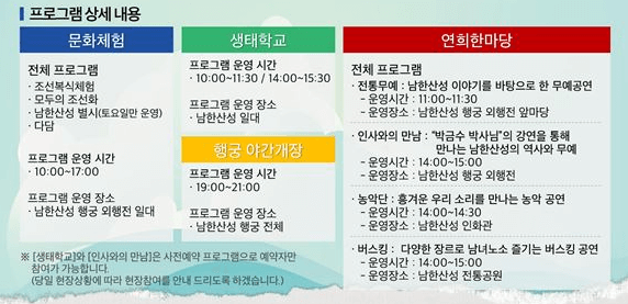 단 남한산성 별시, 숲생태학교, 인사와의만남 등은 사전예약이 필요하니, 아래에서 꼭 예약을 하시길 바랍니다.