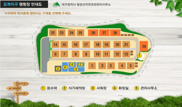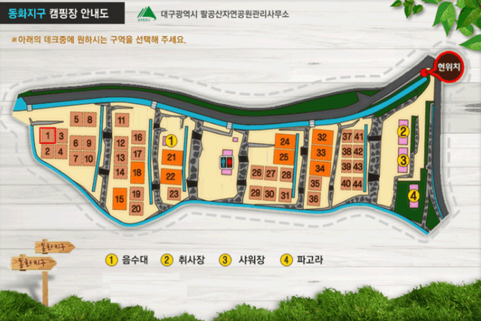 - 제일 하단에 위치한 41~44번 데크의 경우 취사장 바로 앞이라 짐 옮기기엔 편하나 주말에 바로 옆 식당손님으로 인해 시끄러울 수 있음