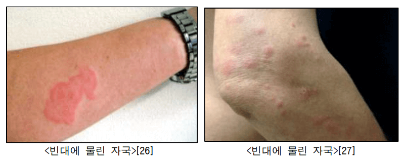 빈대에 물리면 위와 같은 물린 자국과 증상이 발생됩니다.