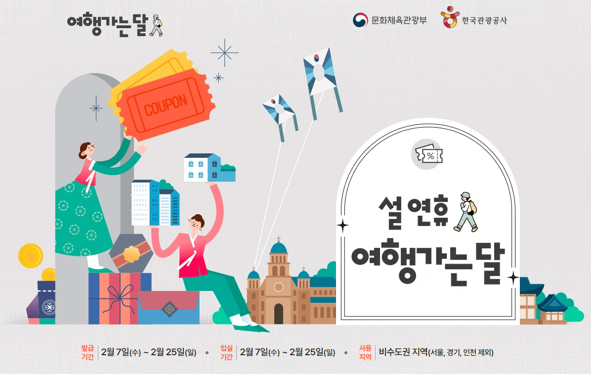 설연휴가 낀 2월달을 '여행가는 달'로 지정하여 숙박 할인권을 제공하는데, 선착순으로 제공하기 때문에 빨리 신청하서야 합니다.