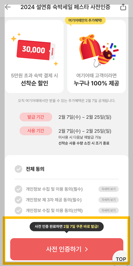 위의 할인쿠폰은 선착순으로 진행되어 티켓팅을 해야하는데, 여기어때 앱을 통해 사전인증을 할 경우 티켓팅할 필요없이