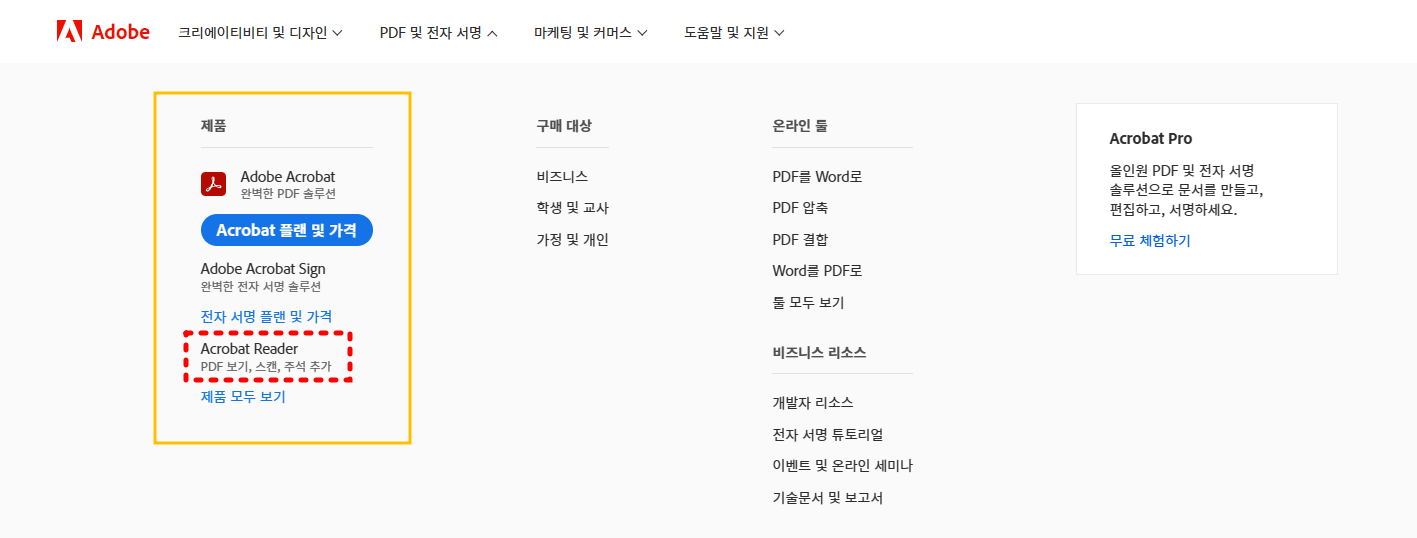 ②왼쪽 <제품> 카테고리의 'Acrobat Reader'를 클릭해 줍니다.