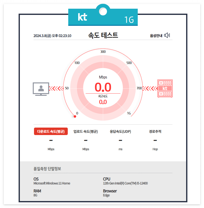 KT가 아닌 다른 인터넷망을 사용하더라도 측정이 가능하며, 여러 가지 항목을 자세히 측정해 줘 신뢰도가 높은 방법이라 가장 추천드리는 방법입니다.