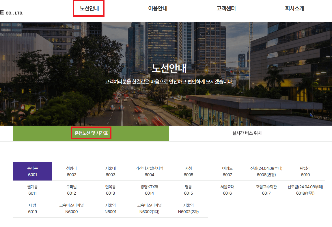 2. 홈페이지 상단 노선안내 선택 후 운행노선 및 시간표 선택