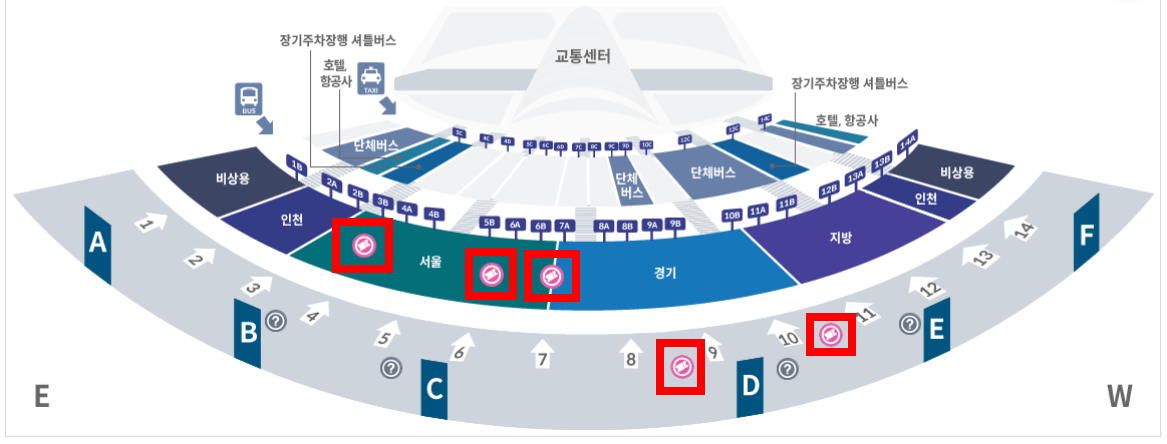 - 외부 : 제1여객터미널 1층(4, 6, 7, 8, 11, 13번 출구 근처)
