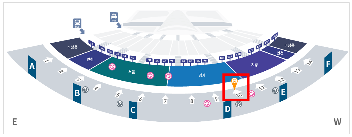 인천공항 제1여객터미널 버스 타는 곳은 서울, 경기, 지방, 인천 등으로 나뉘어 있습니다.