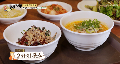 단돈 만원에 다른 종류의 국수를 맛볼 수 있는 가성비 메뉴가 있습니다. 고기국수, 고기 비빔국수, 얼큰 국수 중 2가지를 선택할 수 있습니다. 방송에서 추성훈씨와 허영만씨는 고기비빔국수와 얼큰고기국수를 골라서 먹었습니다.