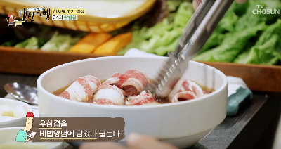 백반기행에서 추성훈은 우삼겹 쌈밥정식을 주문하였습니다. 우삼겹을 그냥 구워먹는 것이 아니라 비법 양념 소스에 살짝 담갔다가 구워 먹습니다. 이렇게하면 소스가 고기 잡내를 잡아줄 뿐만 아니라 감칠맛이 올라가고, 우삼겹의 기름진 맛을 중화시켜 줘서 먹기 더 좋아진다고 합니다. (사장님이 고기잡내에 예민해서 고기잡내를 잡기 위해 맹물에 간장, 감초, 계피, 월계수잎, 후추 등을 넣고 소스를 개발했다고 합니다.)