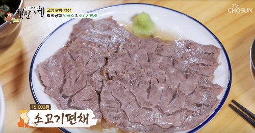 막국수와 함께 먹으면 더욱 맛있는 '소고기 편채'입니다. 소고기 편채는 원래 임금님 밥상에 오르던 귀한 음식이었다고 합니다. 아롱사태로 만든 소고기편채는 야들야들한 살코기와 중간에 힘줄이 주는 쫄깃함이 어우러져 맛이 좋습니다.