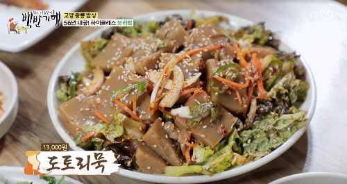주문 즉시 도토리묵을 썰어 야채들과 무쳐주는데, 시중에 파는 묵과는 전혀 다른 맛을 맛볼 수 있습니다. 탱글탱글하면서 차진 식감과 묵 특유의 쌉싸름한 맛이 일품입니다!