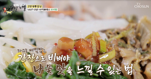 백반기행에서 허영만 씨는 나물 본연의 맛을 느끼기 위해 비빔밥에 간장을 넣고 드시는 것을 추천하더라고요. 늘 고추장을 넣고 비빔밥을 드셨던 분들은 이번기회에 간장을 넣고 한번 드셔보세요! (사실 고추장이든 간장이든 본인의 취향대로 비벼드시면 되죠^^)