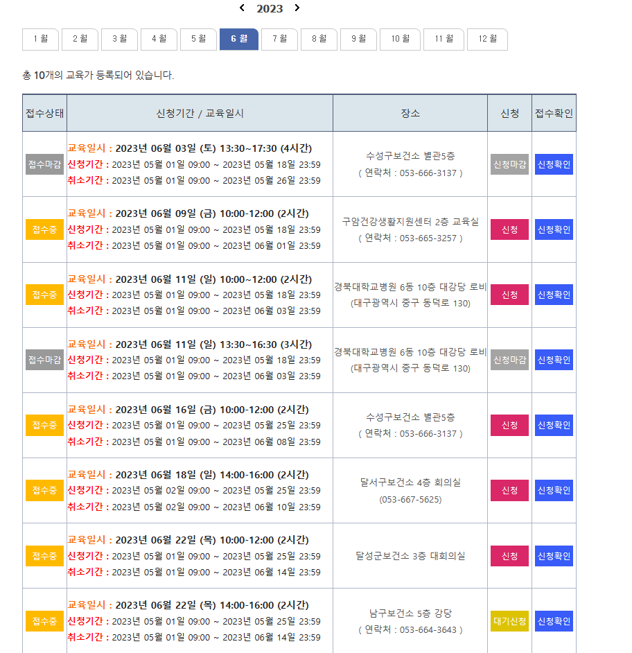 대구시 심폐소생술 교육은 무료 운영되며, 대구광역시 주민이라면 누구나 신청이 가능합니다. 다만, 신청기간 내에 모집정원이 완료되면 조기 접수 마감될 수 있어 미리 신청 하시는 것을 추천드립니다.