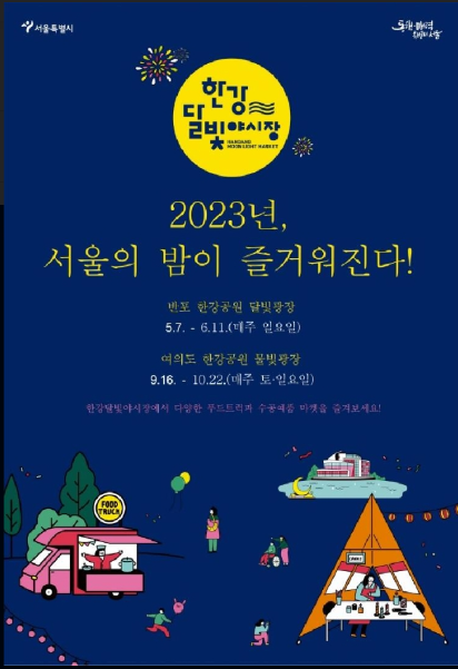 안녕하세요. 2023년 서울 한강달빛야시장이 7일에 개최되었습니다. 이 축제는 상, 하반기에 나눠 총 20회 개최됩니다.